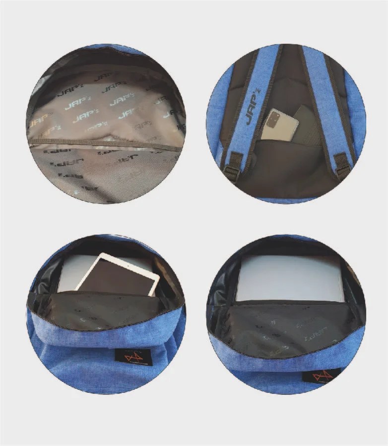 MOCHILA JASPE COLOR AZUL CIERRE DOBLE OCULTO CON JALADERA BOLSA FRONTAL CON CIERRE. TIRANTES ACOGINADOS AJUSTABLES ASA SUPERIOR REFORZADA BOLSA INTERIOR PARA PORTATIL , PARTE TRASERA RIGIDA Y ACOGINADA CON BOLSA ANTIROBO.